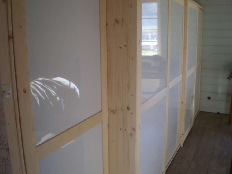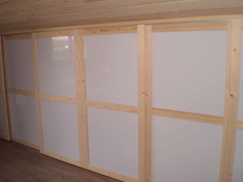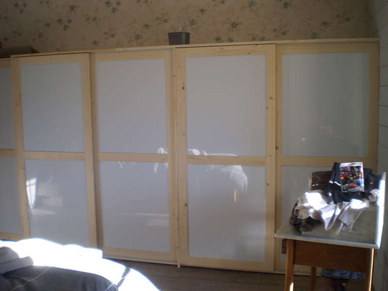 Cet aménagement est réalisé en sapin massif avec un côté étagères et un côté penderie de 3 Mètres . Les 4 portes coulissantes et une porte ouvrant à la Française sont réalisées en sapin et panneaux de plexiglace blanc opaque .