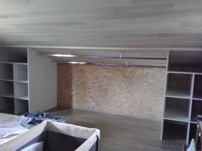 Cet aménagement sous pente est réalisé en plaques de mélaminé blanc avec 2 côtés étagères et une penderie de 3 Mètres . Les 6 portes coulissantes sont en sapin et panneaux de plexiglace blanc opaque .