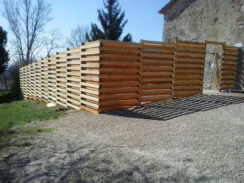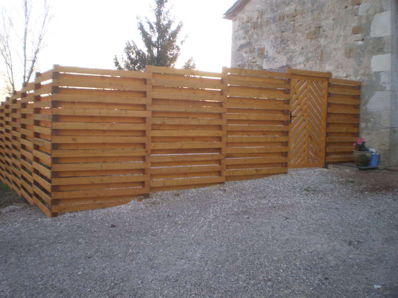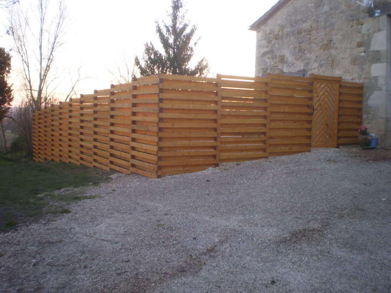 Cette clôture a été réalisé avec des poteaux d'acacia , des planches en sapin posées à claire voie en suivant la pente du terrain , vous découvrirez aussi le portail également réalisé en sapin avec les planchettes à claire voie ( vue de l'intérieur et de l'extèrieur ) .