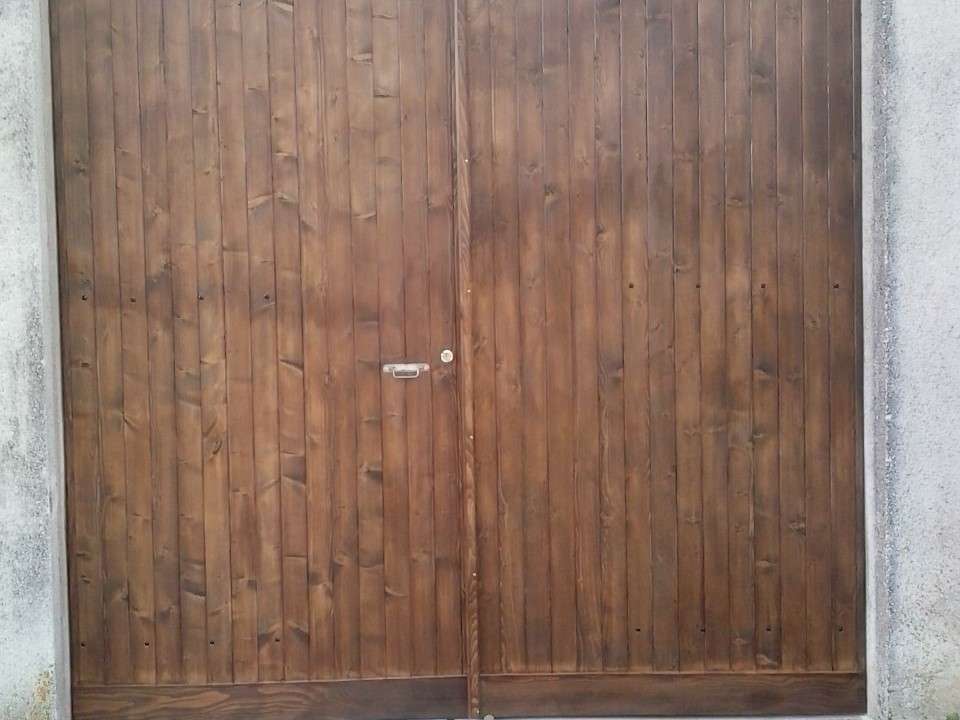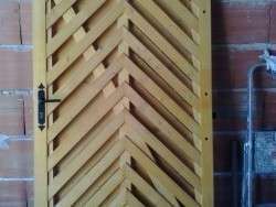 Fermeture d'un cabanon avec du bardage clin et un portail double battant en lames de volet en sapin .